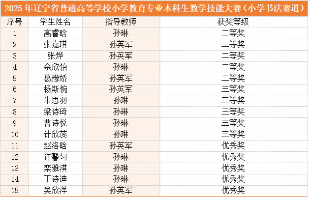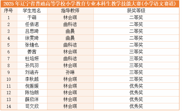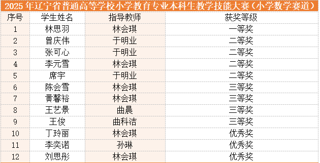 粉笔起落绘课堂,声情并茂展风采。近日,辽宁省高等学校小学教育专业教学技能大赛在大连大学圆满落幕,辽宁师范大学海华学院教学科学学院学子凭借扎实的教学功底与灵动的课堂设计,在比赛中收获佳绩,用青春朝气诠释了“准教师”的专业底色!为了让海华学子在大赛中全力释放专业风采,教育科学学院自接到参赛通知起,便由孙琳老师、林会琪老师等组建起了专业指导团队。从赛事规则的细致拆解,到教学设计的逻辑打磨,从课堂互动的节奏把控,到板书呈现的细节优化,指导老师们全程倾注心血,小学教育的专业特质,锚定每位选手的优势长板与薄弱环节,量身定制一对一精准辅导,帮选手把状态调到“最佳档”。